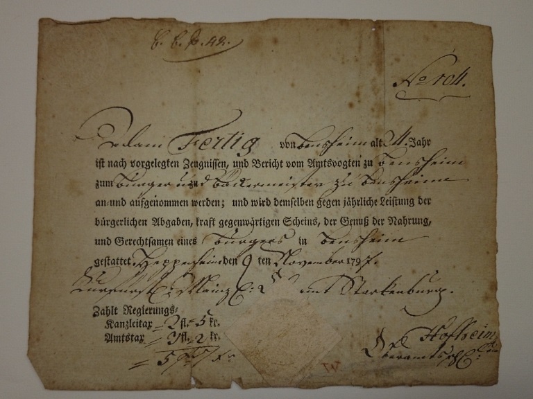adam_fertig_senDie erste Urkunde ist datiert vom 9. November 1797 und bestätigt (soweit ich das entziffern kann) dem 24-jährigen Adam Fertig, dass er als Bürger und Bäckermeister zu Bensheim an- und aufgenommen ist.