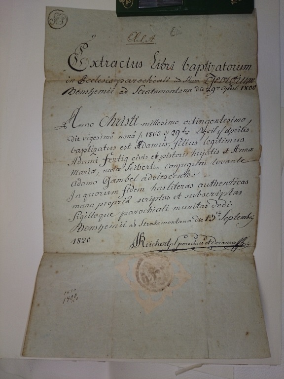 Auszug aus dem TaufregisterOffensichtlich hat es Adam aber wirklich gut gefallen, denn mir liegt eine Abschrift vom 13. September 1820 aus dem Taufregister der Kirche St. Georg zu Bensheim vor: am 29. April 1800 wurde dort Adam junior getauft…
